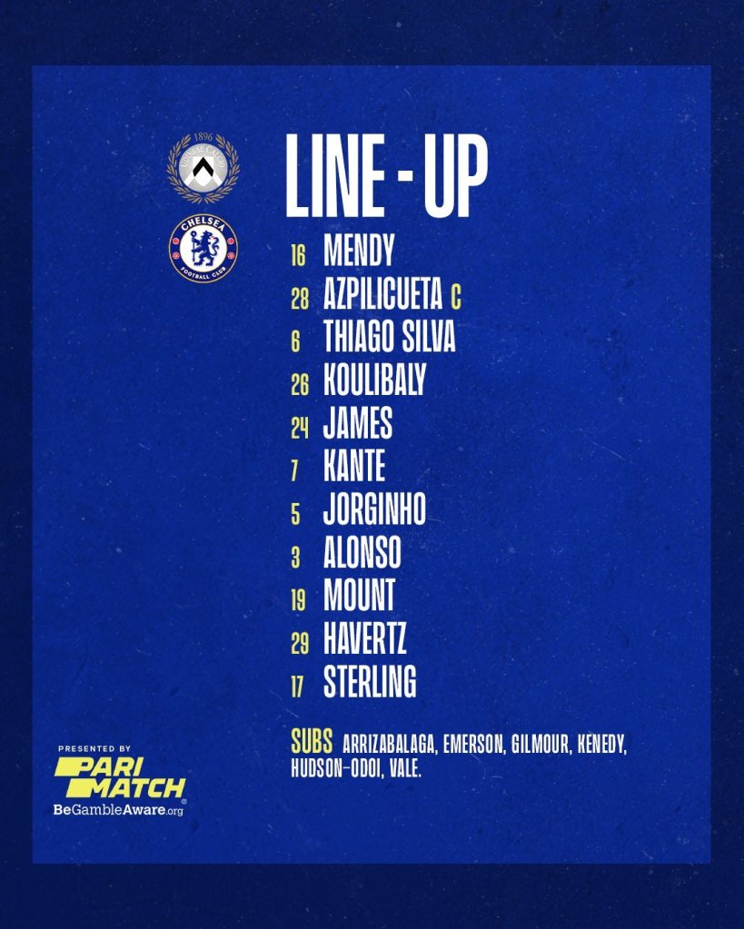 New signing, Raheem Sterling will start alongside Kai Havertz and Mason Mount at the attack. Jorginho and Kante at the middle of the park. Alonso and Reece James to hold the left and right backs respectively.